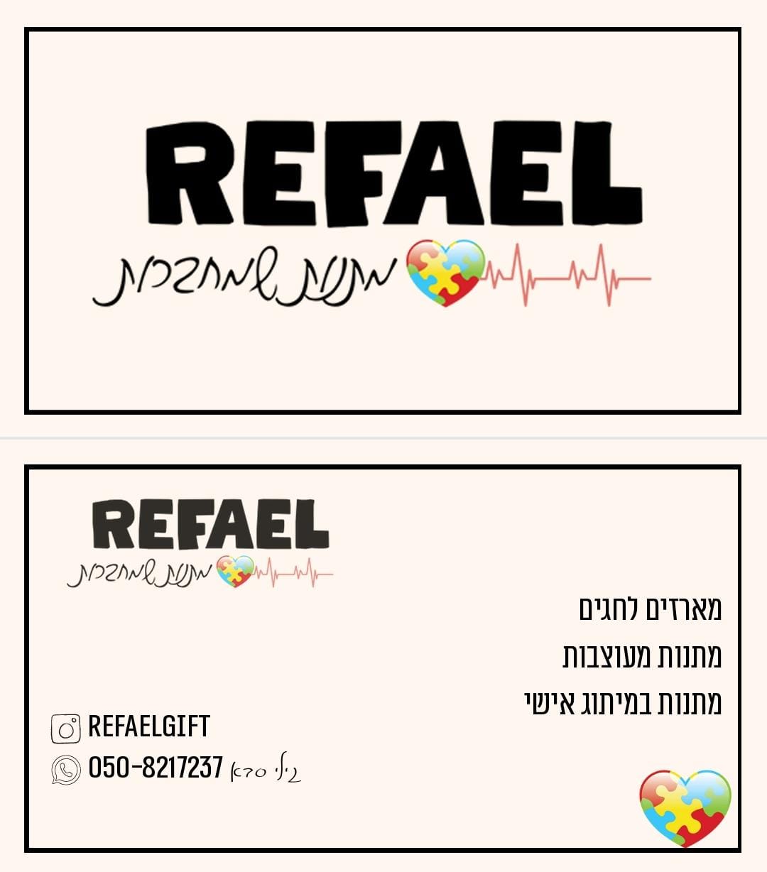 “רפאל מתנות שמחברות” הוא הרבה יותר מעסק ליצירת מתנות ממותגות. זהו סיפור על אהבה, על אמונה, ועל הרצון לבנות לרפאל בני המיוחד עתיד תעסוקתי שיש בו משמעות, גאווה ושייכות אמיתית. העסק נולד מתוך חלום פשוט אך גדול: לאפשר לרפאל לגלות את היכולות שלו, לקחת חלק אמיתי בעשייה, ולדעת שיש לו מקום בעולם שמחבק אותו בדיוק כפי שהוא. היום רפאל משתלב בשלבי עבודה קטנים הדבקה, צילום, מיון אבל בעיקר הוא זוכה למה שכל ילד ובוגר זקוק לו: תחושת שייכות, ערך ומקום. ובעזרת האמונה והדרך שנבנית צעד צעד, אני יודעת שיום אחד הוא לא רק ישתתף בעסק הוא יהיה הפנים שלו. כי אצלנו, כל מתנה היא הרבה יותר ממוצר. כל מתנה היא חיבורים: חיבור בין הלב של מי שמכין לבין הלב של מי שמקבל, וחיבור בין עולמו של ילד מיוחד לבין הקהילה שסביבו.